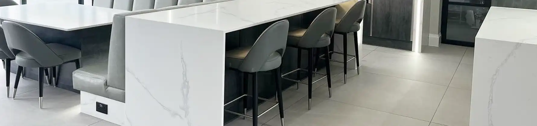 Not only does this kitchen design have the beauty of a Large Island Bar, it also has the added splendour of a featured seating area complete with a matching Itastone quartz dining Table from Bespoke Tables, Liverpool.